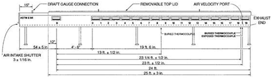 The testing equipment for ASTM E84 is a tunnel oven, approximately 7.6 meters in length, as shown in the figure below.