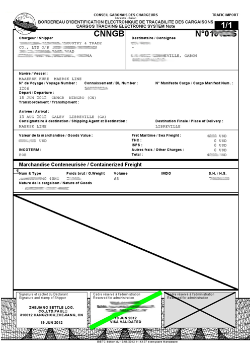 LIBREVILLE requires the processing of Gabon BIC/CRN cargo tracking documents in Libreville