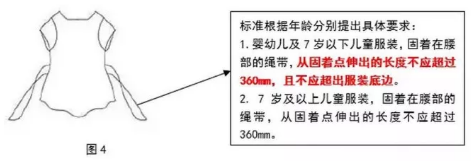 3 | 机械安全 | 标准对儿童服装头颈、肩部、腰部等不同部位绳带作出详细规定,要求婴幼儿及7 岁以下儿童服装头颈部不允许存在任何绳带; 标准对纺织附件也做出了规定,要求附件应具有一定的抗拉强力,且不应存在锐利尖端和边缘。 |